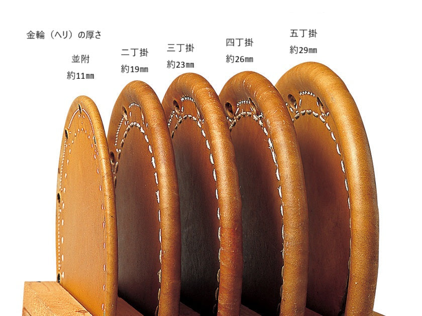 締太鼓は甲高く突き抜けるような高音で演奏をリードする太鼓です。金輪に張って縫い上げた皮を胴で挟んで紐やボルトで締めるところから締太鼓と呼ばれます。並附から五丁掛まで5種類の皮の厚さと数種類の胴の高さを組み合わせる事で音のバリエーションが豊富です。能楽から祭囃子、組太鼓まで幅広く用いられます。