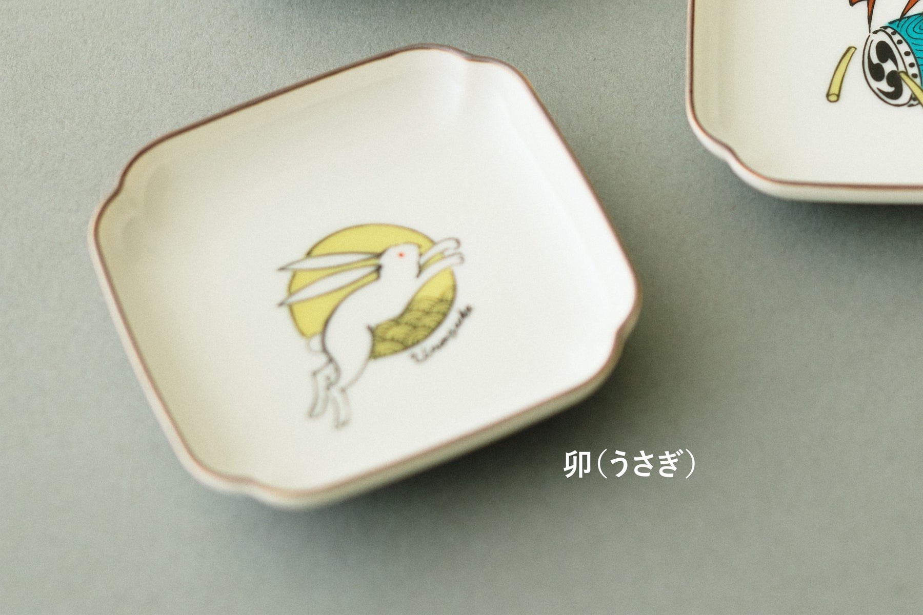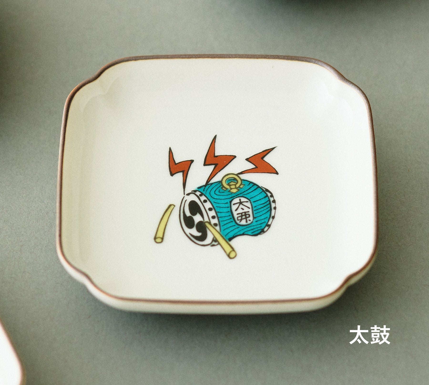 宮本卯之助商店にまつわる5種の絵柄は、上出瓷藝(しげい)の上出惠悟氏による「①卯(うさぎ)②神輿,③太鼓,,④獅子舞,⑤雷門」です。